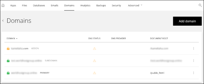 The Domains tab is where you manage your domains. You can add subdomains, addon domains, and aliases. You can also configure domain settings, such as the document root directory, DNS settings, and more: