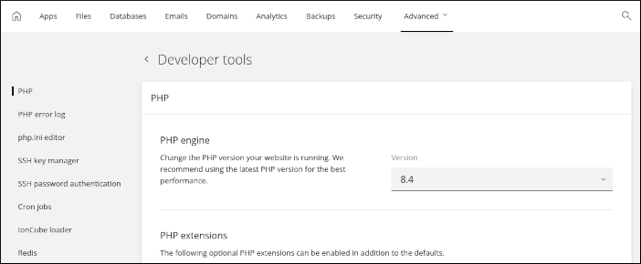 Developer tools: You can access several advanced settings here, including PHP settings and cron jobs. You can also view and configure SSH connection details for your account.