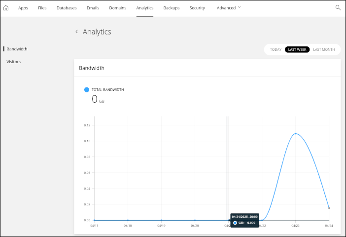 The Analytics tab is where you can view bandwidth usage and visitor stats for your website. You can view statistics for today, last week, or last month: