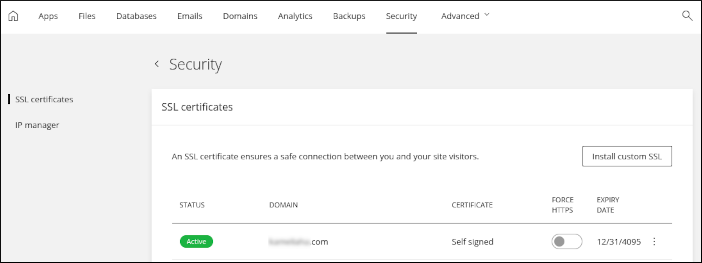 The Security tab is where you manage SSL certificates for your site, and allow or block specific IP addresses: